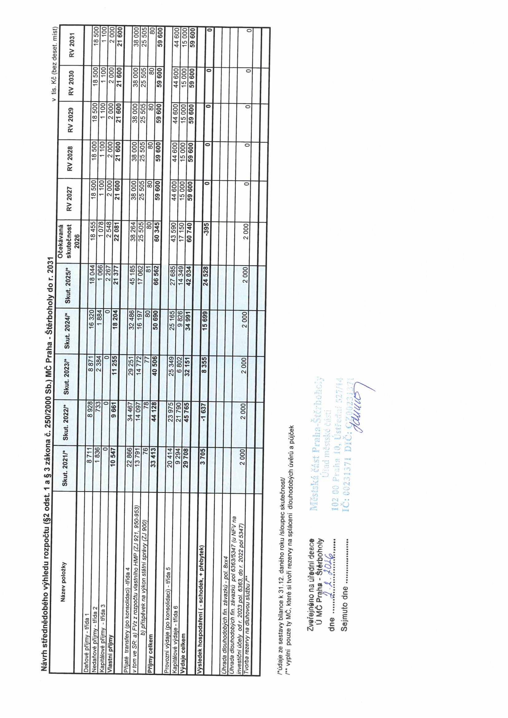 Návrh střednědobého výhledu rozpočtu MČ Praha Štěrboholy do r. 2031